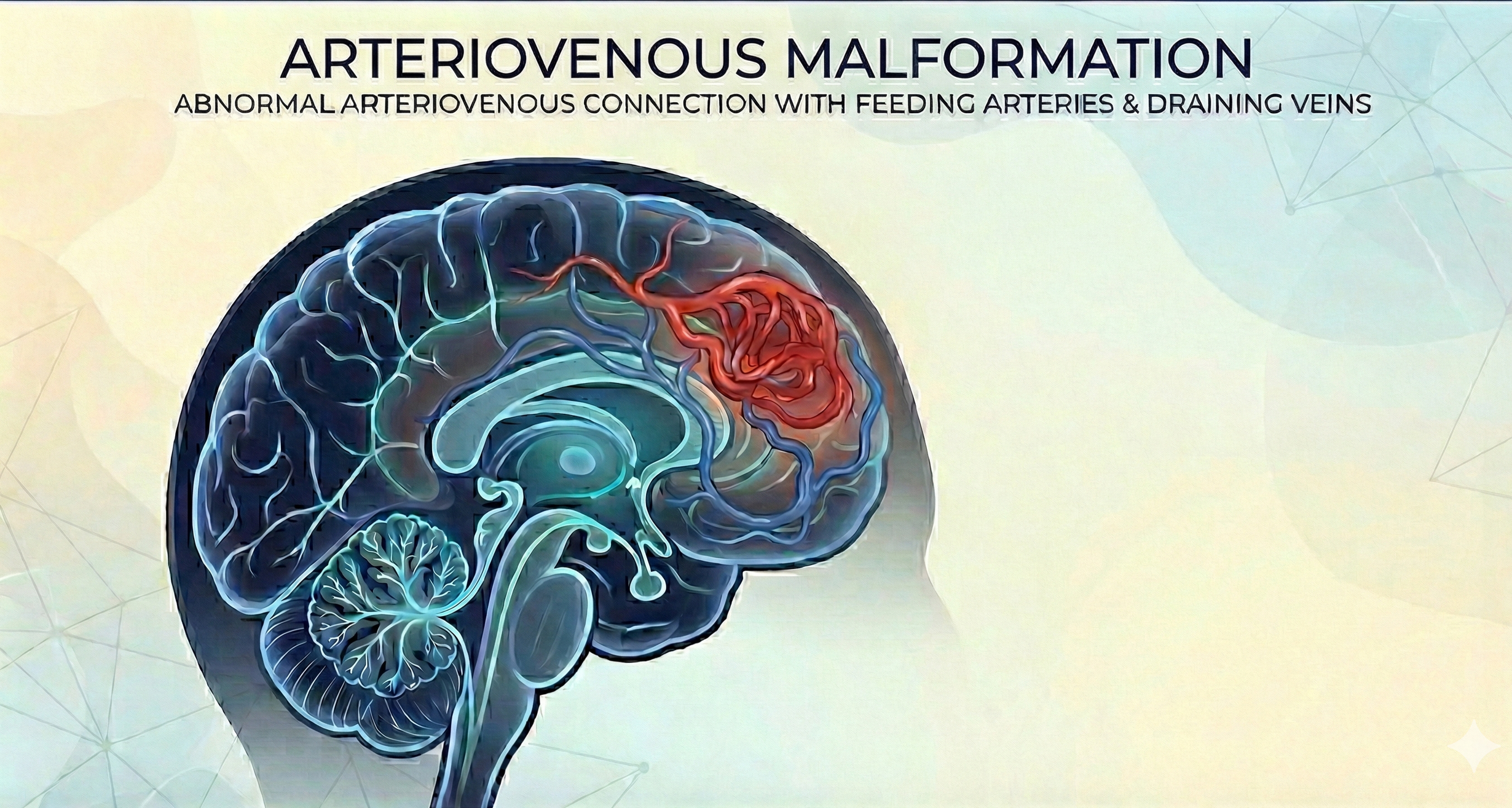 A brain arteriovenous malformation (AVM) is an abnormal tangle of blood vessels where arteries connect directly to veins without the usual network of tiny capillaries in between. This creates a high-flow shunt that can weaken vessel walls and increase the risk of bleeding into the brain.